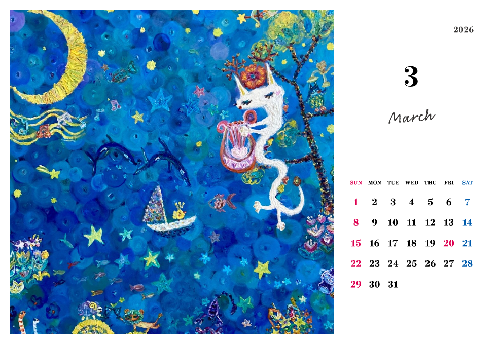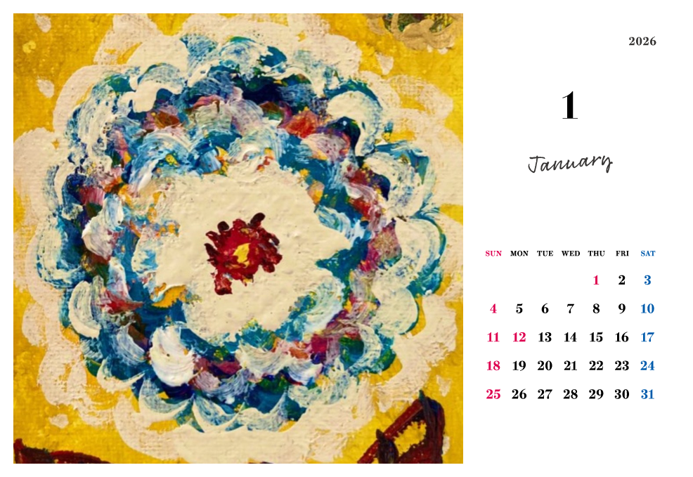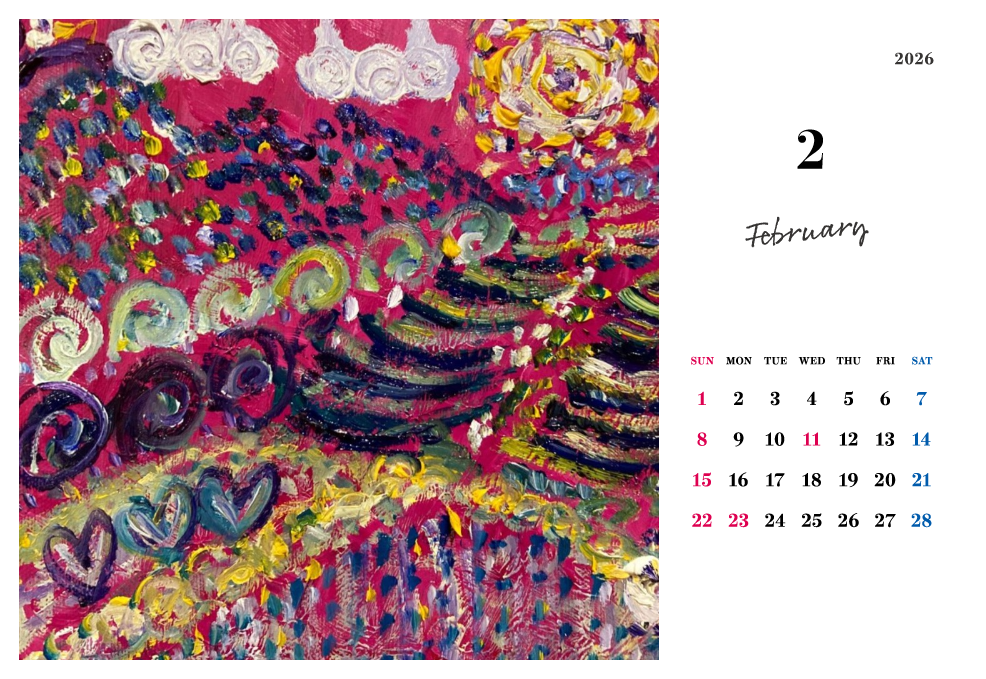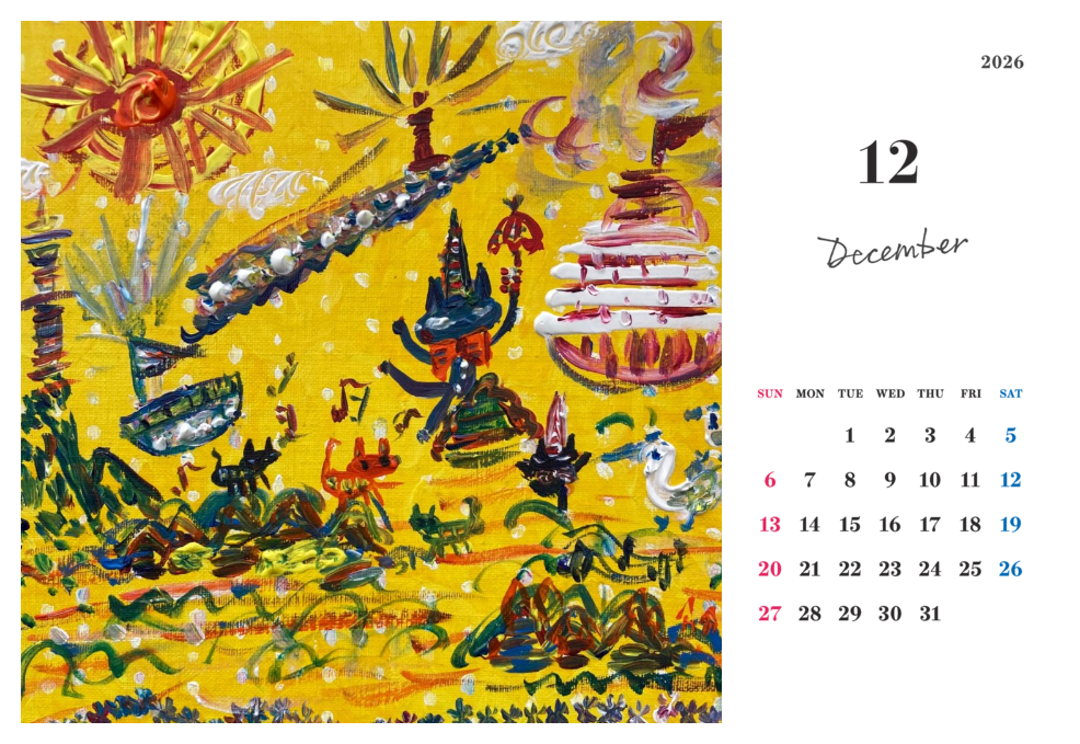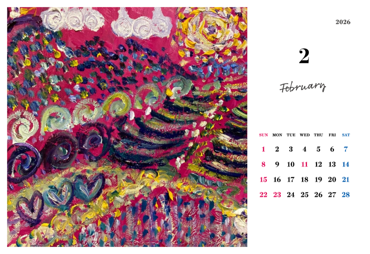 月ごとに変わる絵は、季節のリズムや心の動きを映し出すように、やさしく、時に力強く語りかけてきます。 スッキリとしたスタンドタイプのポストカードサイズで、日々の暮らしの中に静かな芸術の灯をともしてくれる一冊です。